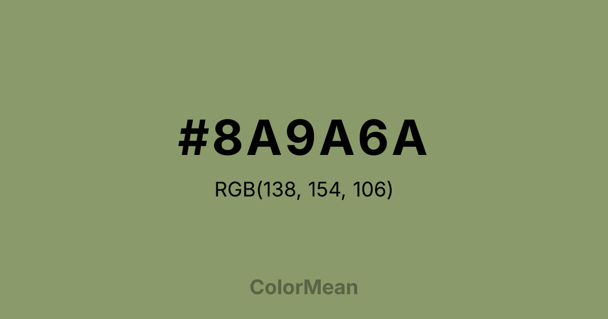 #8A9A6A RGB value is (138, 154, 106). The hex color red value is 138, green is 154, and blue is 106. Its HSL format shows a hue of 80°, saturation of 19 percent, and lightness of 51 percent. The CMYK process values are 10 percent, 0 percent, 31 percent, 40 percent.