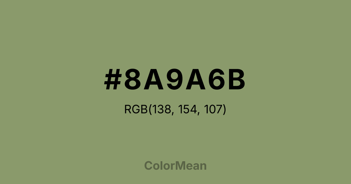 #8A9A6B RGB value is (138, 154, 107). The hex color red value is 138, green is 154, and blue is 107. Its HSL format shows a hue of 80°, saturation of 19 percent, and lightness of 51 percent. The CMYK process values are 10 percent, 0 percent, 31 percent, 40 percent.