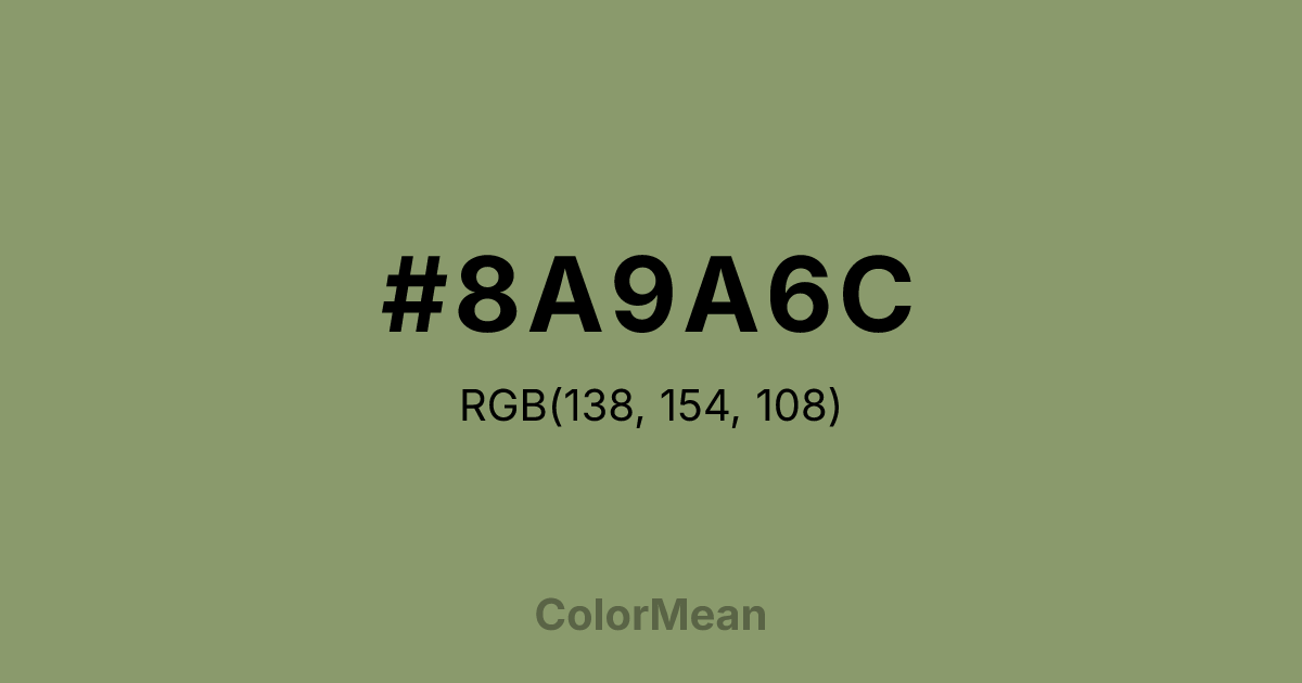 #8A9A6C RGB value is (138, 154, 108). The hex color red value is 138, green is 154, and blue is 108. Its HSL format shows a hue of 81°, saturation of 19 percent, and lightness of 51 percent. The CMYK process values are 10 percent, 0 percent, 30 percent, 40 percent.