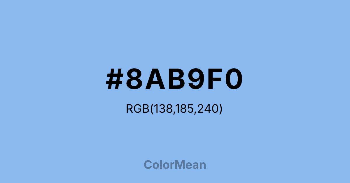 #8AB9F0 RGB value is (138, 185, 240). The hex color red value is 138, green is 185, and blue is 240. Its HSL format shows a hue of 212°, saturation of 77 percent, and lightness of 74 percent. The CMYK process values are 43 percent, 23 percent, 0 percent, 6 percent.