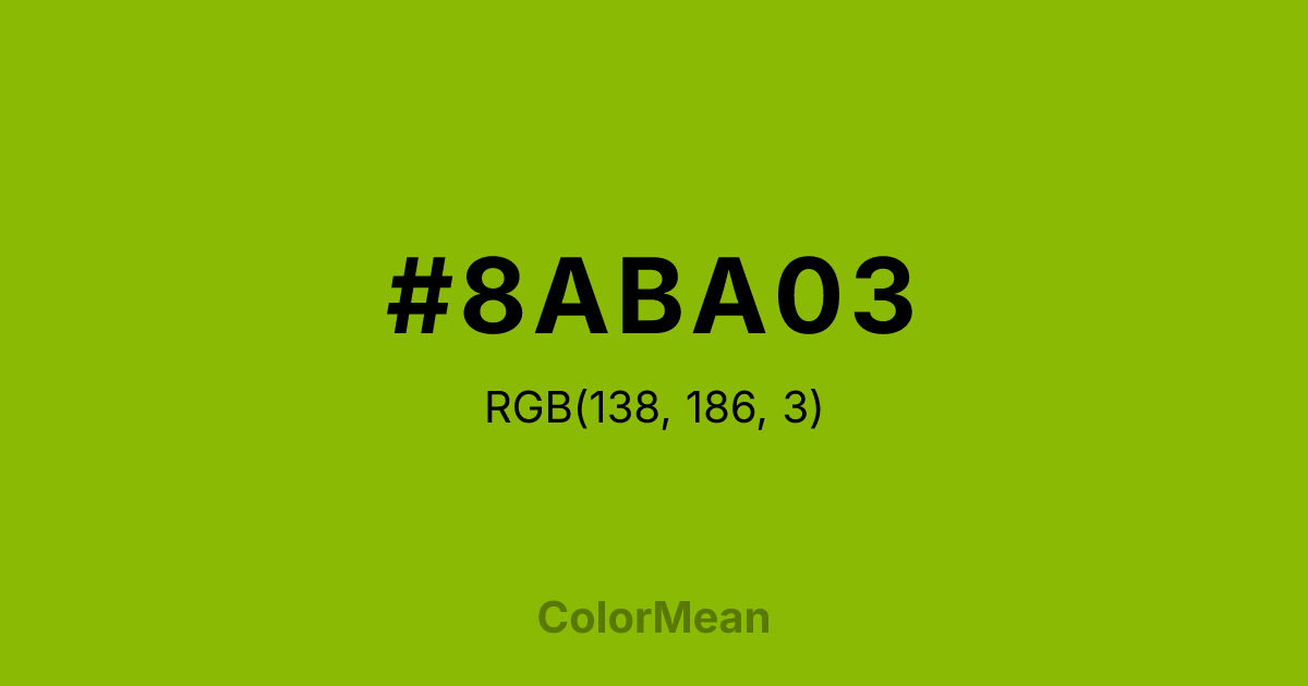 #8ABA03 RGB value is (138, 186, 3). The hex color red value is 138, green is 186, and blue is 3. Its HSL format shows a hue of 76°, saturation of 97 percent, and lightness of 37 percent. The CMYK process values are 26 percent, 0 percent, 98 percent, 27 percent.