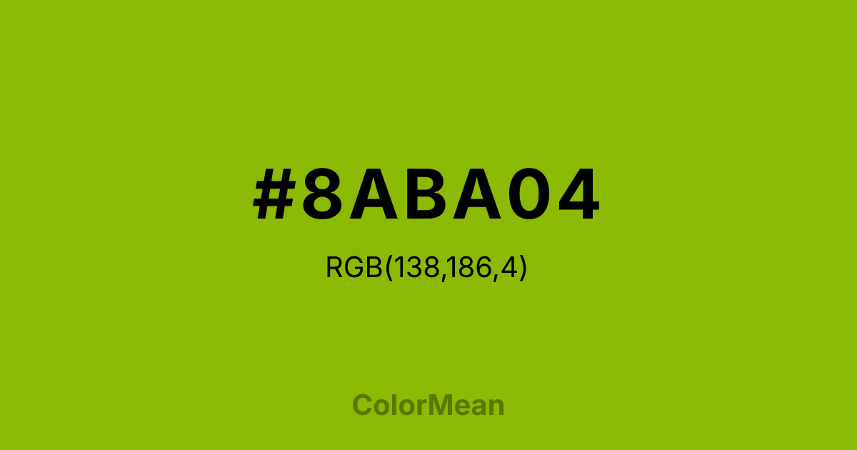 #8ABA04 RGB value is (138, 186, 4). The hex color red value is 138, green is 186, and blue is 4. Its HSL format shows a hue of 76°, saturation of 96 percent, and lightness of 37 percent. The CMYK process values are 26 percent, 0 percent, 98 percent, 27 percent.