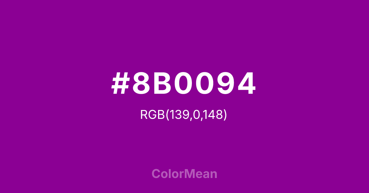 #8B0094 RGB value is (139, 0, 148). The hex color red value is 139, green is 0, and blue is 148. Its HSL format shows a hue of 296°, saturation of 100 percent, and lightness of 29 percent. The CMYK process values are 6 percent, 100 percent, 0 percent, 42 percent.