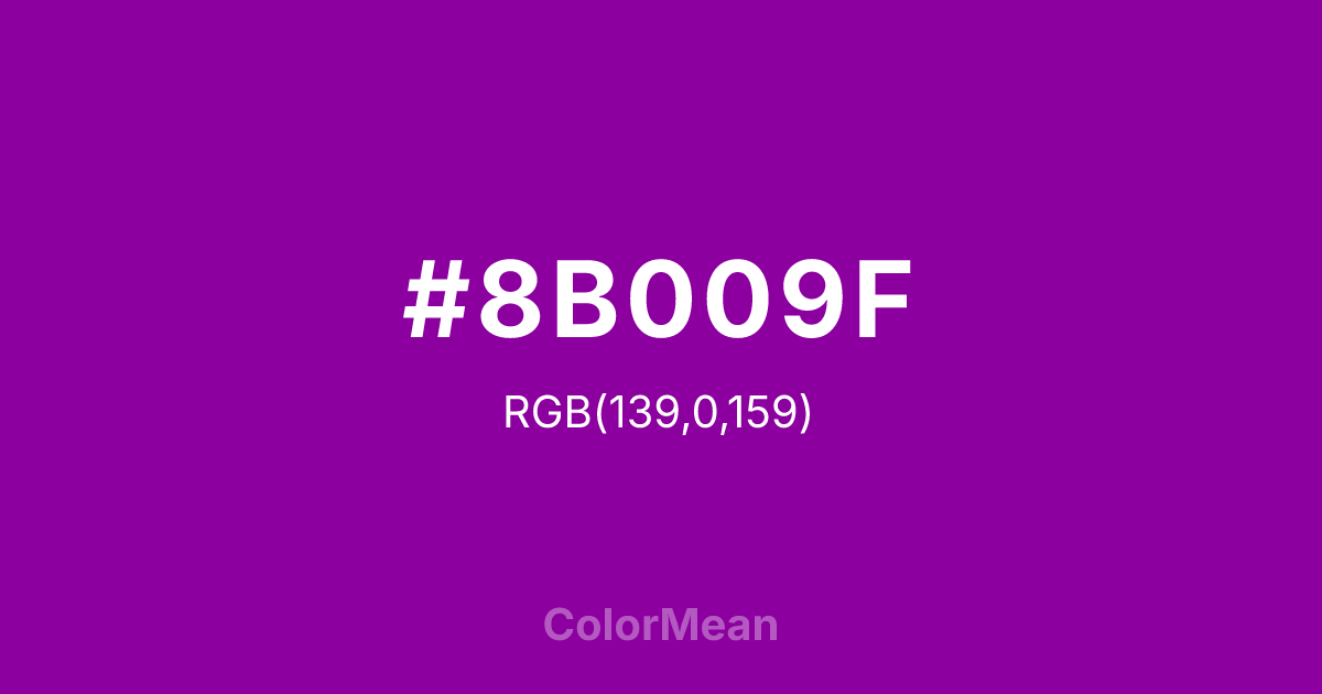 #8B009F RGB value is (139, 0, 159). The hex color red value is 139, green is 0, and blue is 159. Its HSL format shows a hue of 292°, saturation of 100 percent, and lightness of 31 percent. The CMYK process values are 13 percent, 100 percent, 0 percent, 38 percent.
