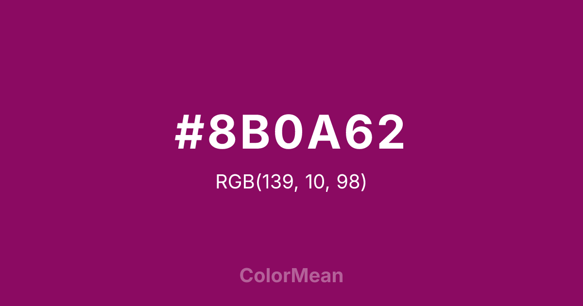 #8B0A62 RGB value is (139, 10, 98). The hex color red value is 139, green is 10, and blue is 98. Its HSL format shows a hue of 319°, saturation of 87 percent, and lightness of 29 percent. The CMYK process values are 0 percent, 93 percent, 29 percent, 45 percent.