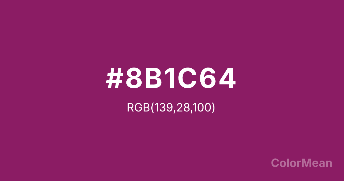 #8B1C64 RGB value is (139, 28, 100). The hex color red value is 139, green is 28, and blue is 100. Its HSL format shows a hue of 321°, saturation of 66 percent, and lightness of 33 percent. The CMYK process values are 0 percent, 80 percent, 28 percent, 45 percent.