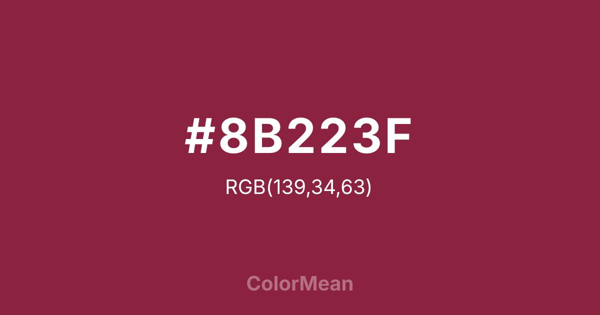 #8B223F RGB value is (139, 34, 63). The hex color red value is 139, green is 34, and blue is 63. Its HSL format shows a hue of 343°, saturation of 61 percent, and lightness of 34 percent. The CMYK process values are 0 percent, 76 percent, 55 percent, 45 percent.
