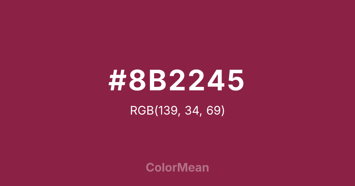 #8B2245 RGB value is (139, 34, 69). The hex color red value is 139, green is 34, and blue is 69. Its HSL format shows a hue of 340°, saturation of 61 percent, and lightness of 34 percent. The CMYK process values are 0 percent, 76 percent, 50 percent, 45 percent.