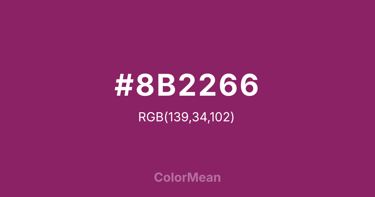 #8B2266 RGB value is (139, 34, 102). The hex color red value is 139, green is 34, and blue is 102. Its HSL format shows a hue of 321°, saturation of 61 percent, and lightness of 34 percent. The CMYK process values are 0 percent, 76 percent, 27 percent, 45 percent.