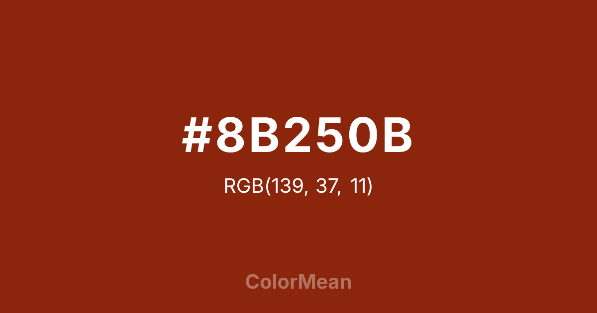 #8B250B RGB value is (139, 37, 11). The hex color red value is 139, green is 37, and blue is 11. Its HSL format shows a hue of 12°, saturation of 85 percent, and lightness of 29 percent. The CMYK process values are 0 percent, 73 percent, 92 percent, 45 percent.