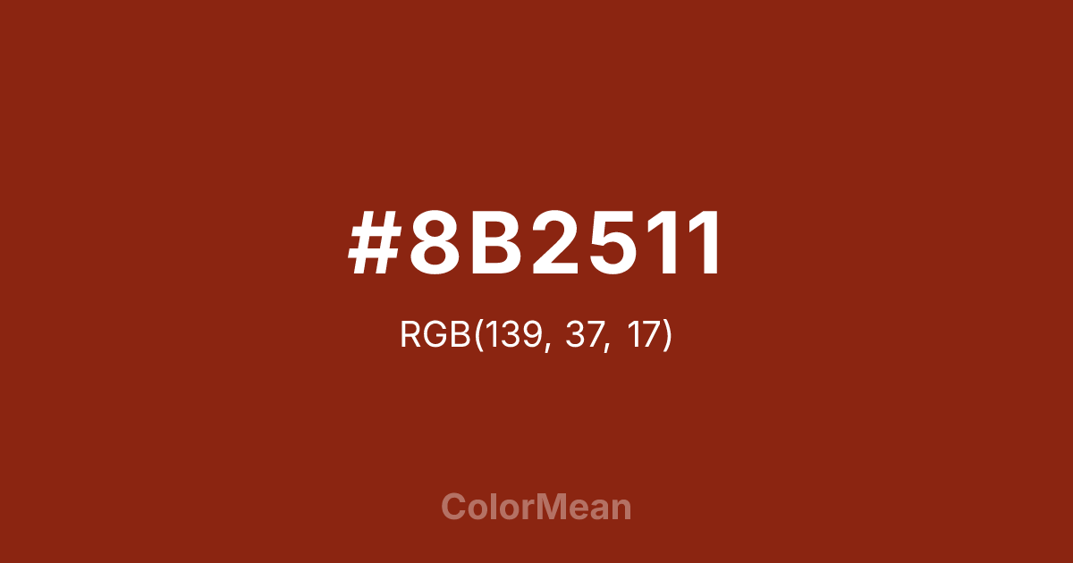 #8B2511 RGB value is (139, 37, 17). The hex color red value is 139, green is 37, and blue is 17. Its HSL format shows a hue of 10°, saturation of 78 percent, and lightness of 31 percent. The CMYK process values are 0 percent, 73 percent, 88 percent, 45 percent.