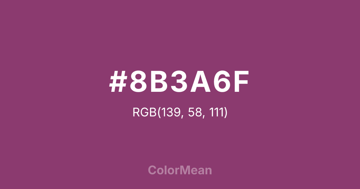 #8B3A6F RGB value is (139, 58, 111). The hex color red value is 139, green is 58, and blue is 111. Its HSL format shows a hue of 321°, saturation of 41 percent, and lightness of 39 percent. The CMYK process values are 0 percent, 58 percent, 20 percent, 45 percent.