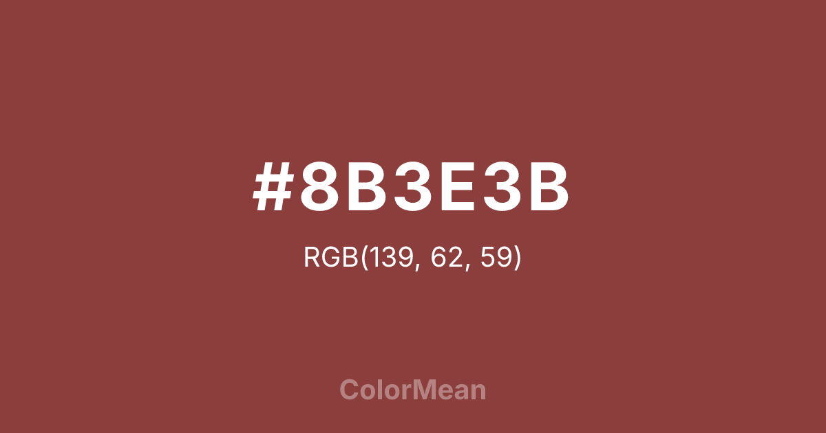 #8B3E3B RGB value is (139, 62, 59). The hex color red value is 139, green is 62, and blue is 59. Its HSL format shows a hue of 2°, saturation of 40 percent, and lightness of 39 percent. The CMYK process values are 0 percent, 55 percent, 58 percent, 45 percent.