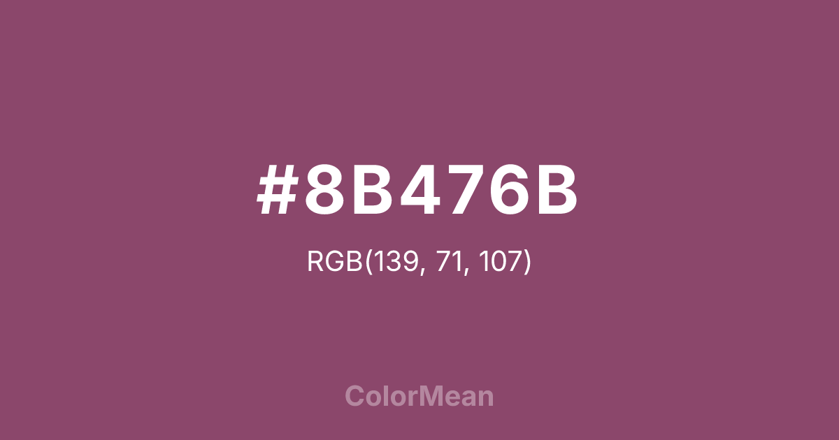 #8B476B RGB value is (139, 71, 107). The hex color red value is 139, green is 71, and blue is 107. Its HSL format shows a hue of 328°, saturation of 32 percent, and lightness of 41 percent. The CMYK process values are 0 percent, 49 percent, 23 percent, 45 percent.