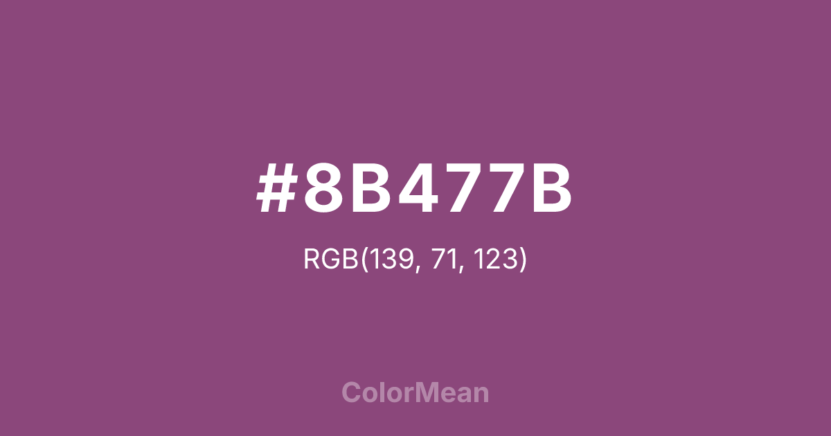 #8B477B RGB value is (139, 71, 123). The hex color red value is 139, green is 71, and blue is 123. Its HSL format shows a hue of 314°, saturation of 32 percent, and lightness of 41 percent. The CMYK process values are 0 percent, 49 percent, 12 percent, 45 percent.