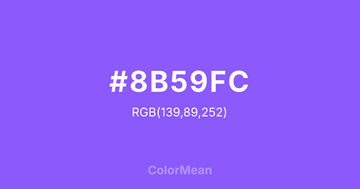 #8B59FC RGB value is (139, 89, 252). The hex color red value is 139, green is 89, and blue is 252. Its HSL format shows a hue of 258°, saturation of 96 percent, and lightness of 67 percent. The CMYK process values are 45 percent, 65 percent, 0 percent, 1 percent.