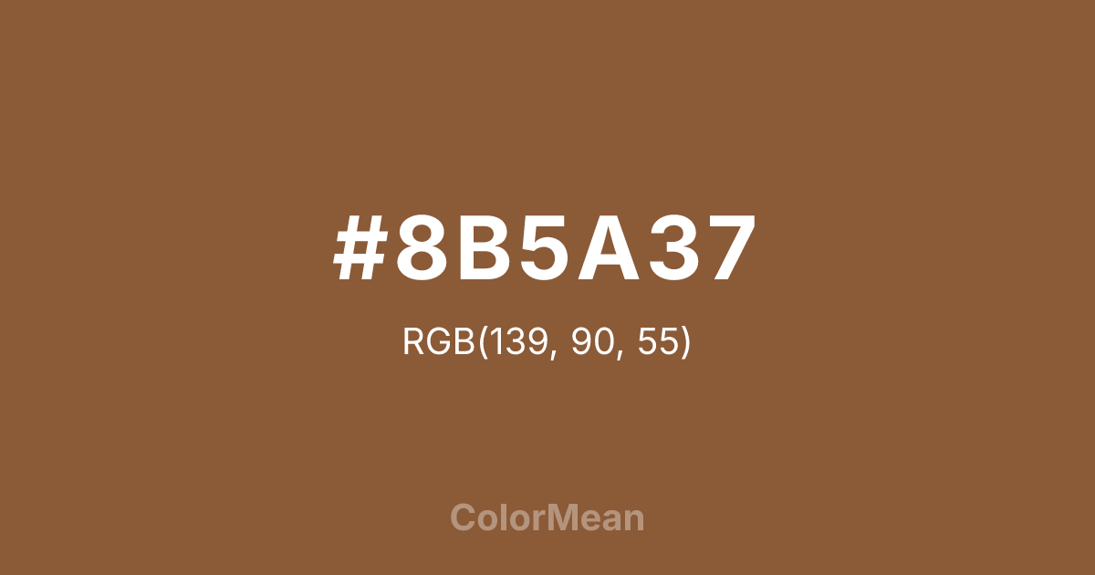 #8B5A37 RGB value is (139, 90, 55). The hex color red value is 139, green is 90, and blue is 55. Its HSL format shows a hue of 25°, saturation of 43 percent, and lightness of 38 percent. The CMYK process values are 0 percent, 35 percent, 60 percent, 45 percent.