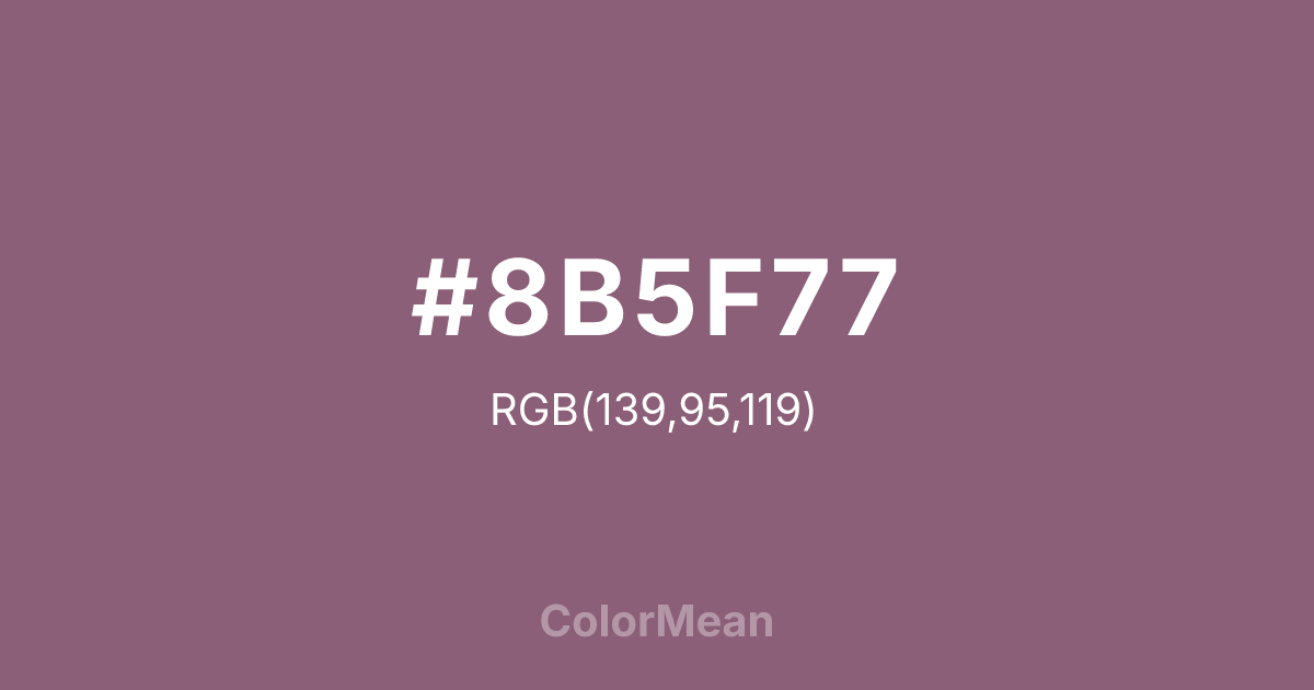 #8B5F77 RGB value is (139, 95, 119). The hex color red value is 139, green is 95, and blue is 119. Its HSL format shows a hue of 327°, saturation of 19 percent, and lightness of 46 percent. The CMYK process values are 0 percent, 32 percent, 14 percent, 45 percent.