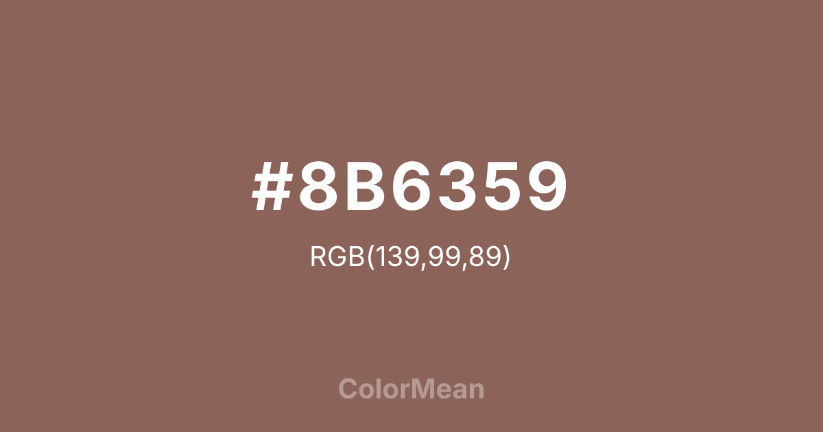 #8B6359 RGB value is (139, 99, 89). The hex color red value is 139, green is 99, and blue is 89. Its HSL format shows a hue of 12°, saturation of 22 percent, and lightness of 45 percent. The CMYK process values are 0 percent, 29 percent, 36 percent, 45 percent.