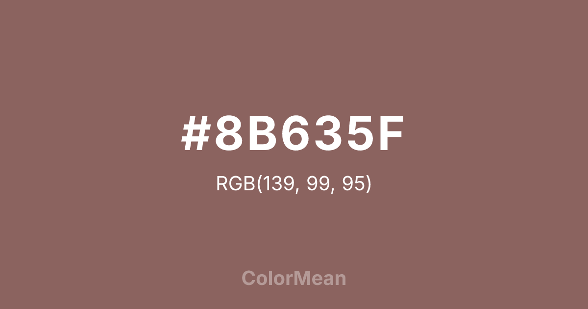 #8B635F RGB value is (139, 99, 95). The hex color red value is 139, green is 99, and blue is 95. Its HSL format shows a hue of 5°, saturation of 19 percent, and lightness of 46 percent. The CMYK process values are 0 percent, 29 percent, 32 percent, 45 percent.