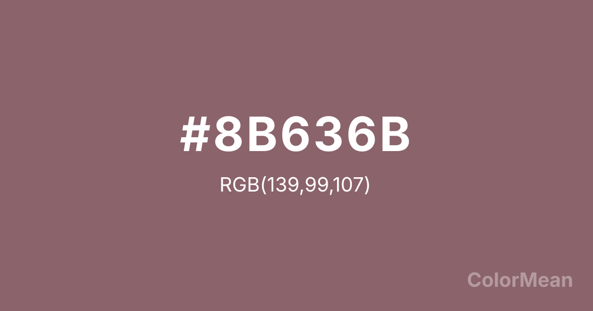 #8B636B RGB value is (139, 99, 107). The hex color red value is 139, green is 99, and blue is 107. Its HSL format shows a hue of 348°, saturation of 17 percent, and lightness of 47 percent. The CMYK process values are 0 percent, 29 percent, 23 percent, 45 percent.
