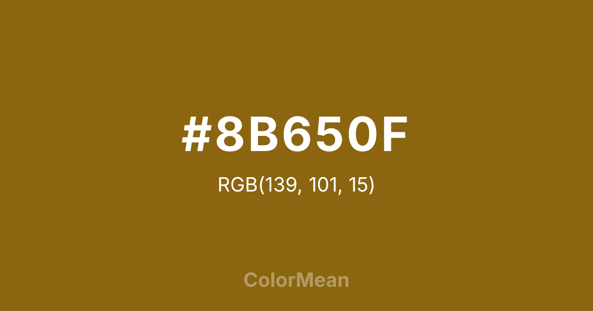 #8B650F RGB value is (139, 101, 15). The hex color red value is 139, green is 101, and blue is 15. Its HSL format shows a hue of 42°, saturation of 81 percent, and lightness of 30 percent. The CMYK process values are 0 percent, 27 percent, 89 percent, 45 percent.