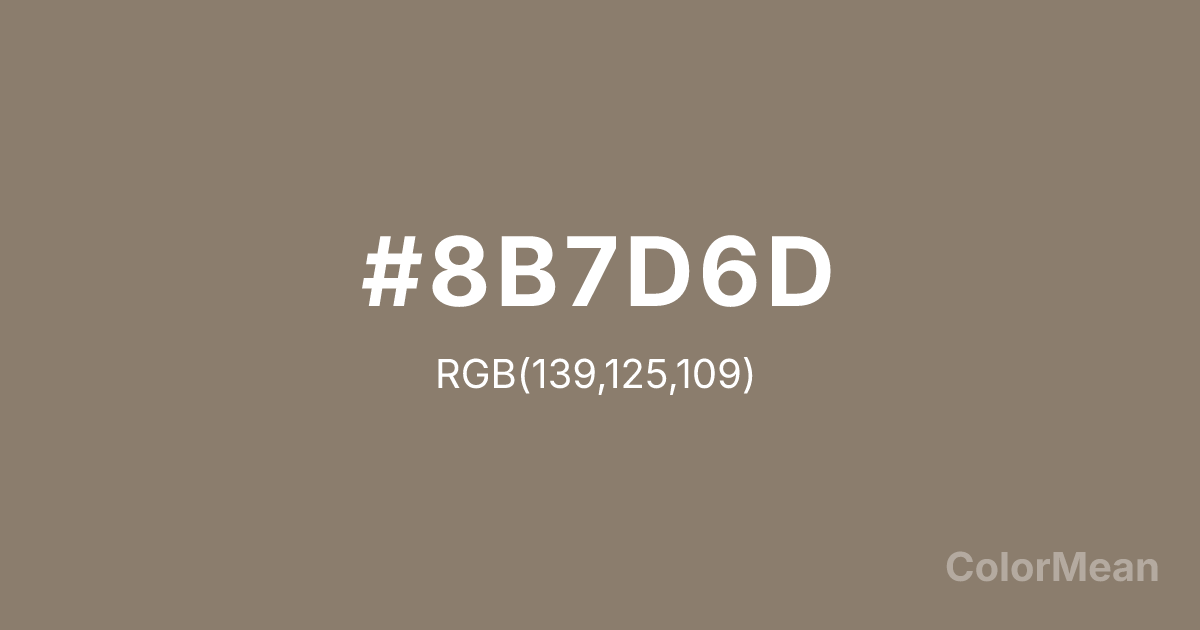 #8B7D6D RGB value is (139, 125, 109). The hex color red value is 139, green is 125, and blue is 109. Its HSL format shows a hue of 32°, saturation of 12 percent, and lightness of 49 percent. The CMYK process values are 0 percent, 10 percent, 22 percent, 45 percent.