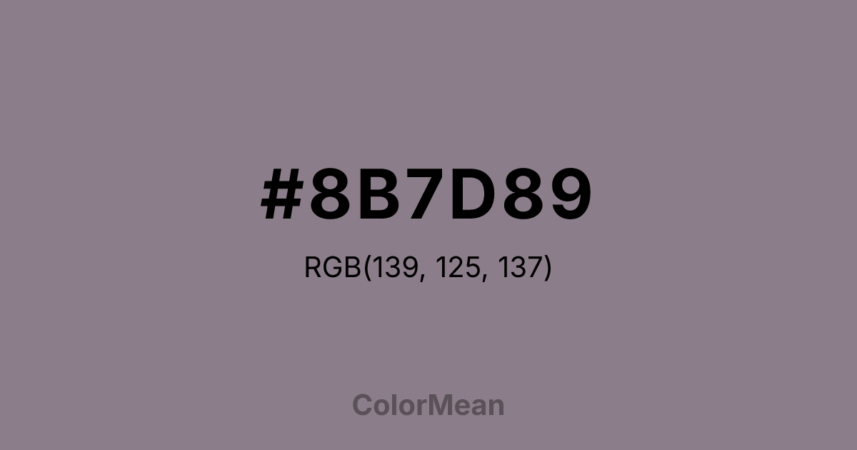 #8B7D89 RGB value is (139, 125, 137). The hex color red value is 139, green is 125, and blue is 137. Its HSL format shows a hue of 309°, saturation of 6 percent, and lightness of 52 percent. The CMYK process values are 0 percent, 10 percent, 1 percent, 45 percent.
