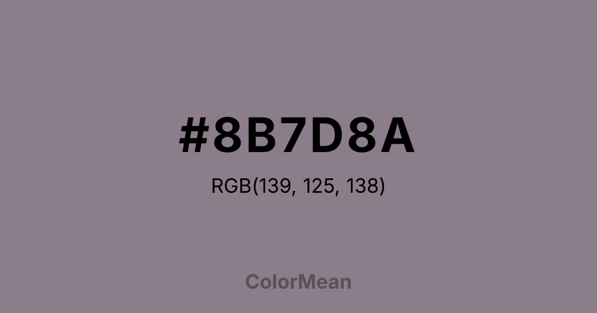 #8B7D8A RGB value is (139, 125, 138). The hex color red value is 139, green is 125, and blue is 138. Its HSL format shows a hue of 304°, saturation of 6 percent, and lightness of 52 percent. The CMYK process values are 0 percent, 10 percent, 1 percent, 45 percent.