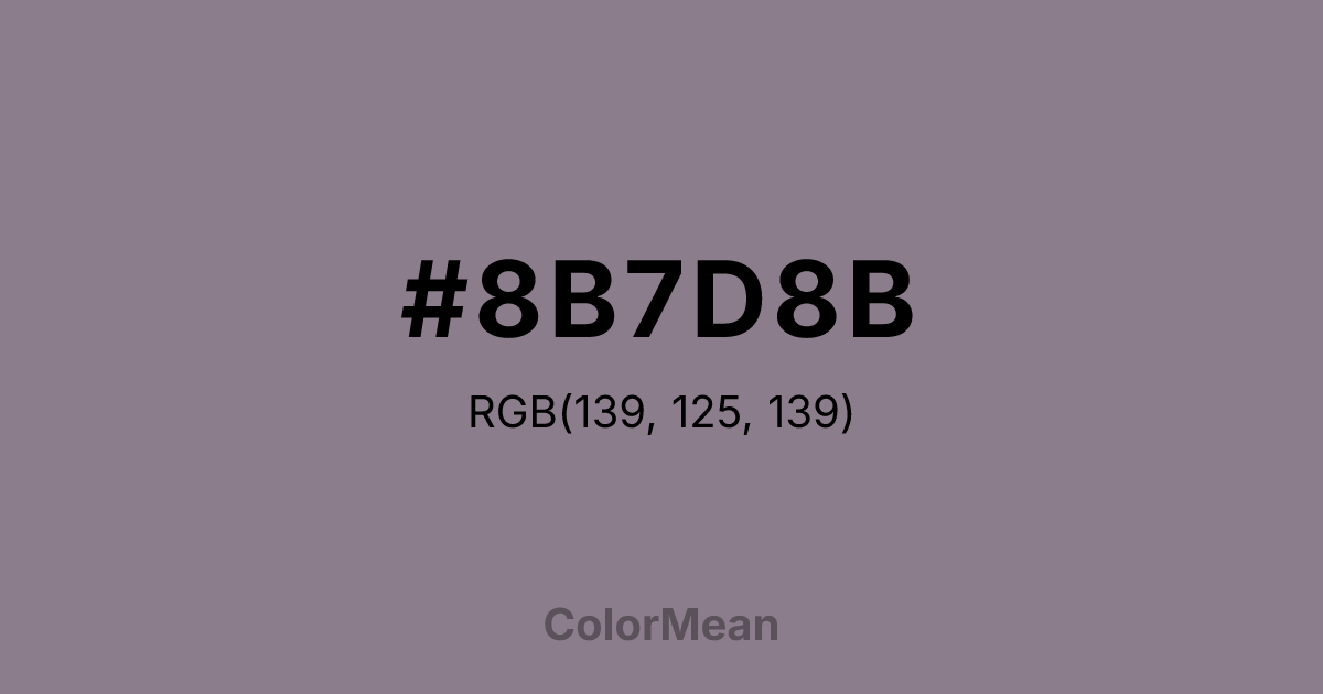 #8B7D8B RGB value is (139, 125, 139). The hex color red value is 139, green is 125, and blue is 139. Its HSL format shows a hue of 300°, saturation of 6 percent, and lightness of 52 percent. The CMYK process values are 0 percent, 10 percent, 0 percent, 45 percent.