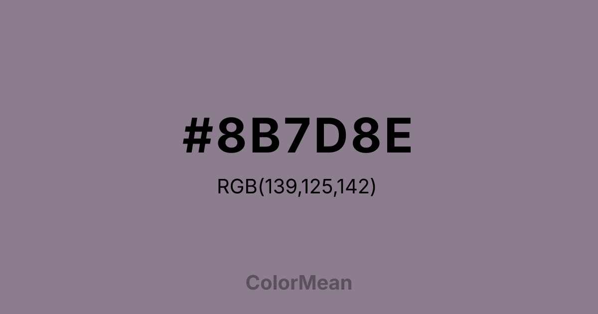 #8B7D8E RGB value is (139, 125, 142). The hex color red value is 139, green is 125, and blue is 142. Its HSL format shows a hue of 289°, saturation of 7 percent, and lightness of 52 percent. The CMYK process values are 2 percent, 12 percent, 0 percent, 44 percent.