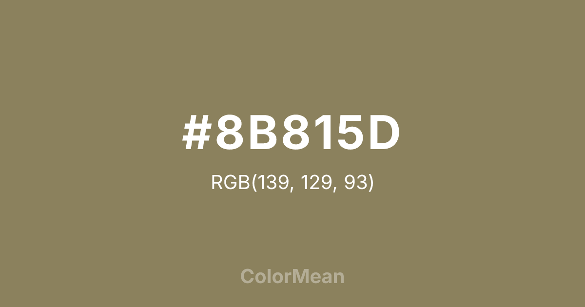 #8B815D RGB value is (139, 129, 93). The hex color red value is 139, green is 129, and blue is 93. Its HSL format shows a hue of 47°, saturation of 20 percent, and lightness of 45 percent. The CMYK process values are 0 percent, 7 percent, 33 percent, 45 percent.