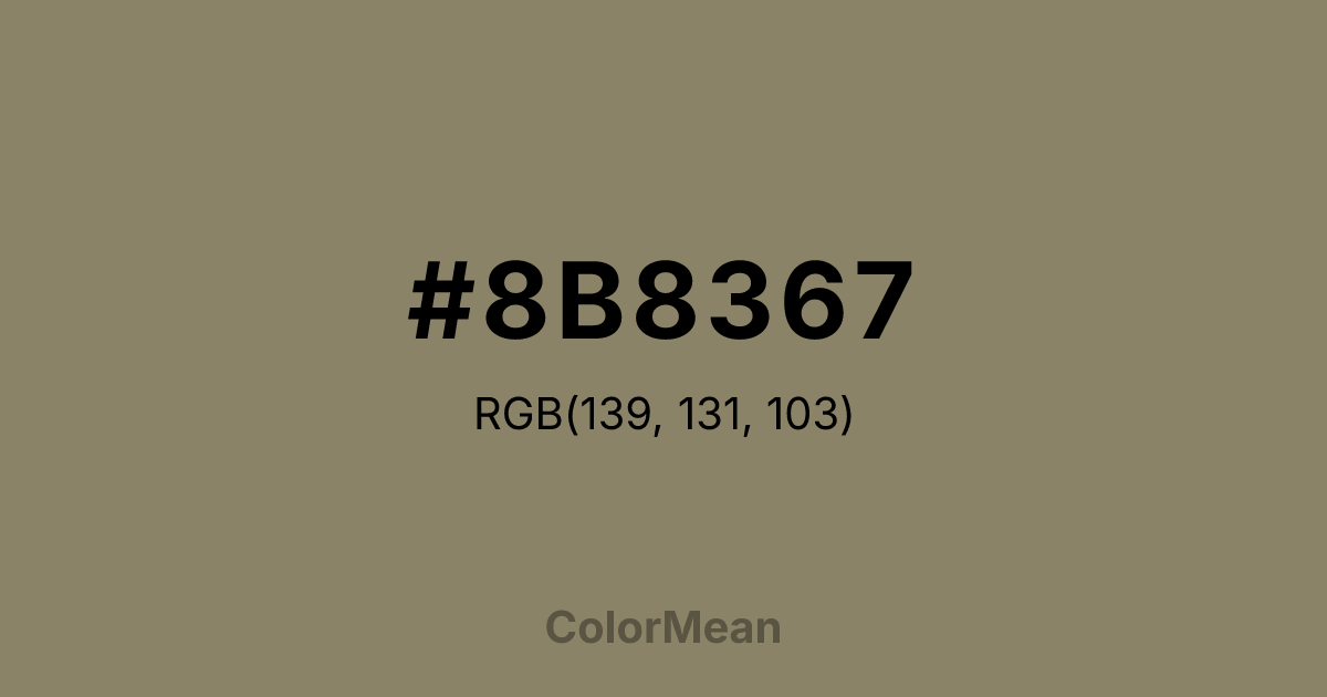 #8B8367 RGB value is (139, 131, 103). The hex color red value is 139, green is 131, and blue is 103. Its HSL format shows a hue of 47°, saturation of 15 percent, and lightness of 47 percent. The CMYK process values are 0 percent, 6 percent, 26 percent, 45 percent.