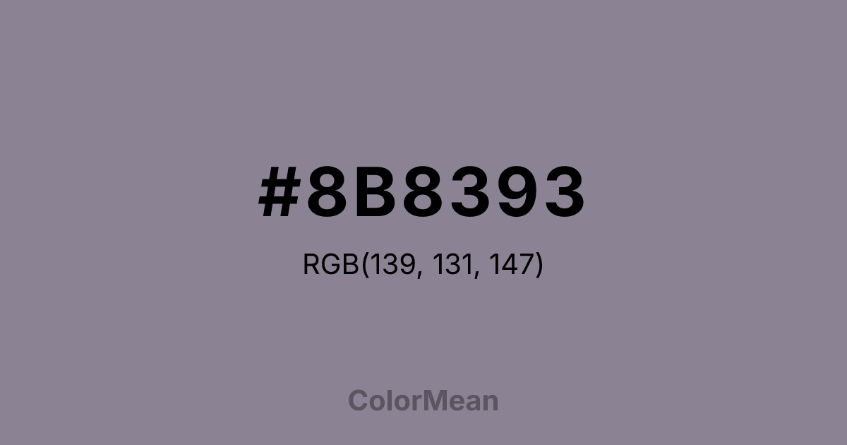 #8B8393 RGB value is (139, 131, 147). The hex color red value is 139, green is 131, and blue is 147. Its HSL format shows a hue of 270°, saturation of 7 percent, and lightness of 55 percent. The CMYK process values are 5 percent, 11 percent, 0 percent, 42 percent.