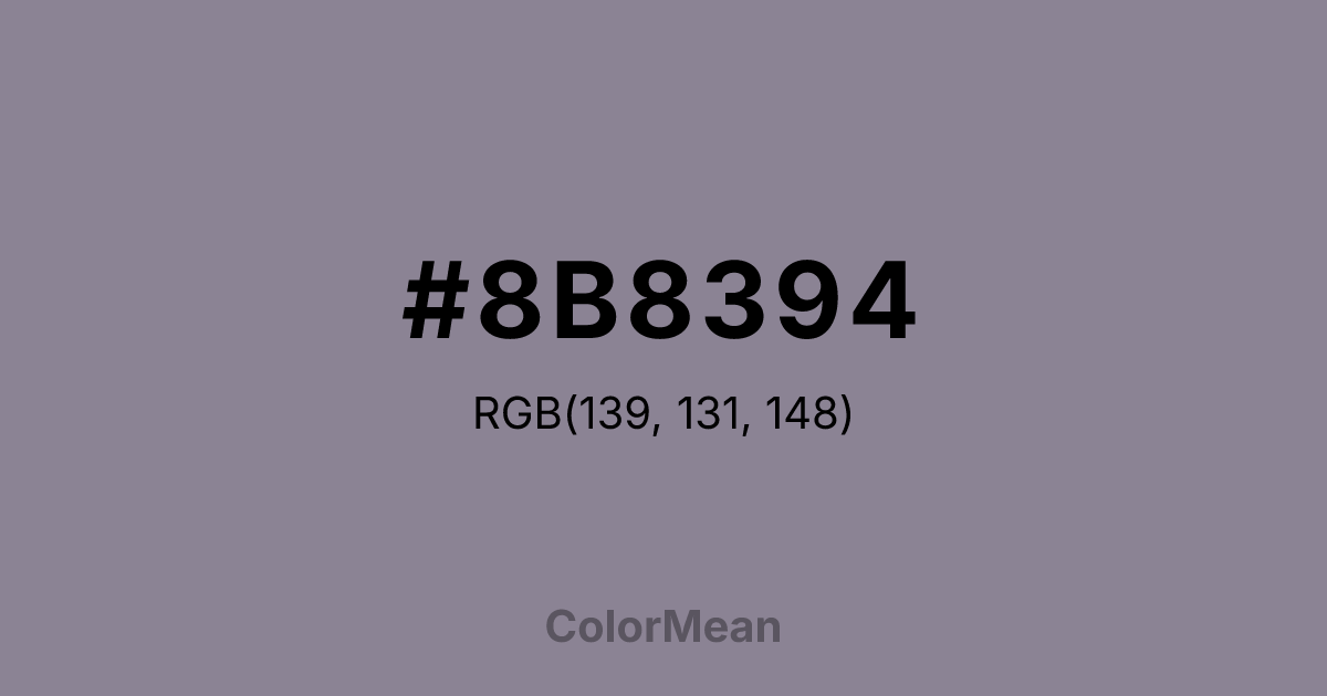 #8B8394 RGB value is (139, 131, 148). The hex color red value is 139, green is 131, and blue is 148. Its HSL format shows a hue of 268°, saturation of 7 percent, and lightness of 55 percent. The CMYK process values are 6 percent, 11 percent, 0 percent, 42 percent.
