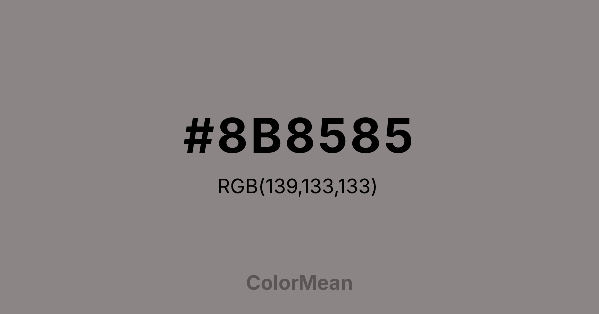 #8B8585 RGB value is (139, 133, 133). The hex color red value is 139, green is 133, and blue is 133. Its HSL format shows a hue of 0°, saturation of 3 percent, and lightness of 53 percent. The CMYK process values are 0 percent, 4 percent, 4 percent, 45 percent.