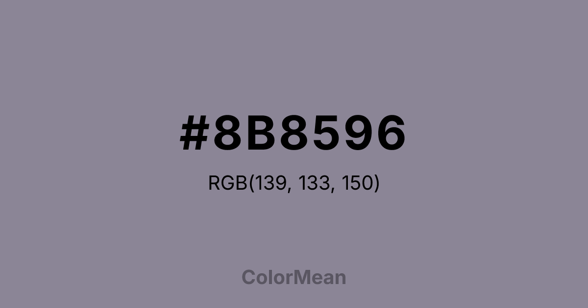 #8B8596 RGB value is (139, 133, 150). The hex color red value is 139, green is 133, and blue is 150. Its HSL format shows a hue of 261°, saturation of 7 percent, and lightness of 55 percent. The CMYK process values are 7 percent, 11 percent, 0 percent, 41 percent.