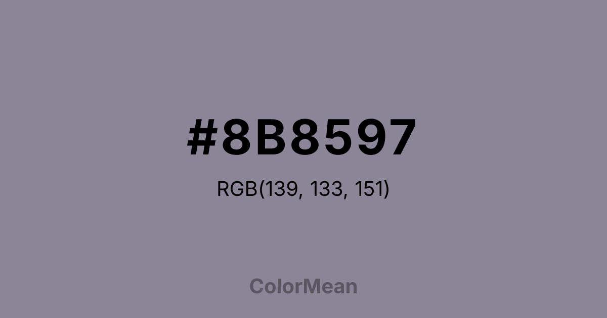#8B8597 RGB value is (139, 133, 151). The hex color red value is 139, green is 133, and blue is 151. Its HSL format shows a hue of 260°, saturation of 8 percent, and lightness of 56 percent. The CMYK process values are 8 percent, 12 percent, 0 percent, 41 percent.