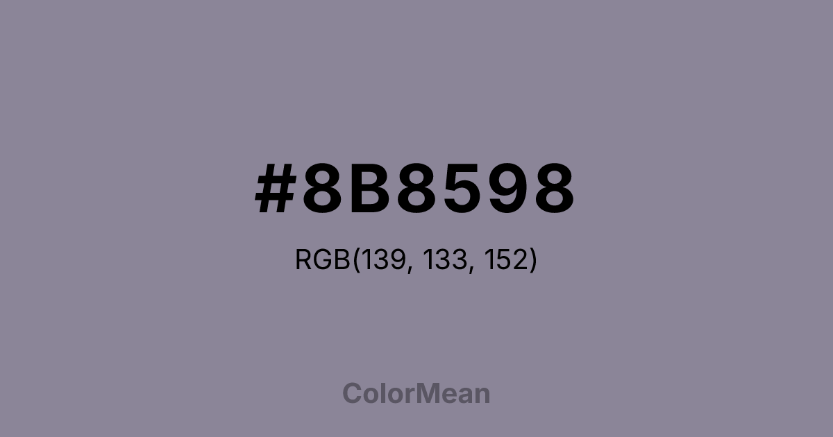 #8B8598 RGB value is (139, 133, 152). The hex color red value is 139, green is 133, and blue is 152. Its HSL format shows a hue of 259°, saturation of 8 percent, and lightness of 56 percent. The CMYK process values are 9 percent, 12 percent, 0 percent, 40 percent.