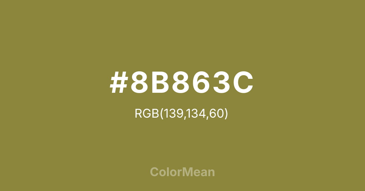 #8B863C RGB value is (139, 134, 60). The hex color red value is 139, green is 134, and blue is 60. Its HSL format shows a hue of 56°, saturation of 40 percent, and lightness of 39 percent. The CMYK process values are 0 percent, 4 percent, 57 percent, 45 percent.
