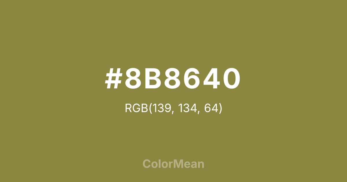 #8B8640 RGB value is (139, 134, 64). The hex color red value is 139, green is 134, and blue is 64. Its HSL format shows a hue of 56°, saturation of 37 percent, and lightness of 40 percent. The CMYK process values are 0 percent, 4 percent, 54 percent, 45 percent.