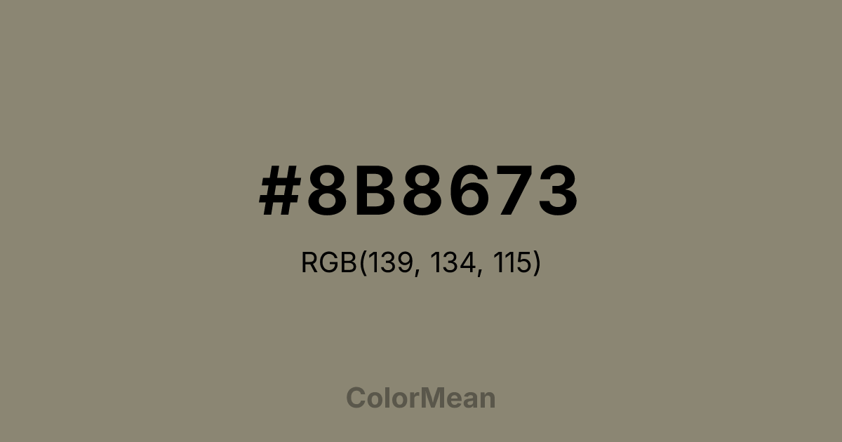 #8B8673 RGB value is (139, 134, 115). The hex color red value is 139, green is 134, and blue is 115. Its HSL format shows a hue of 48°, saturation of 9 percent, and lightness of 50 percent. The CMYK process values are 0 percent, 4 percent, 17 percent, 45 percent.
