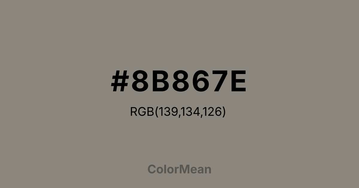 #8B867E RGB value is (139, 134, 126). The hex color red value is 139, green is 134, and blue is 126. Its HSL format shows a hue of 37°, saturation of 5 percent, and lightness of 52 percent. The CMYK process values are 0 percent, 4 percent, 9 percent, 45 percent.