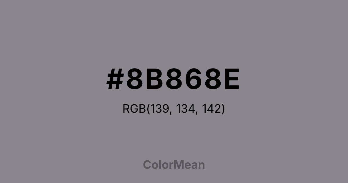 #8B868E RGB value is (139, 134, 142). The hex color red value is 139, green is 134, and blue is 142. Its HSL format shows a hue of 277°, saturation of 3 percent, and lightness of 54 percent. The CMYK process values are 2 percent, 6 percent, 0 percent, 44 percent.