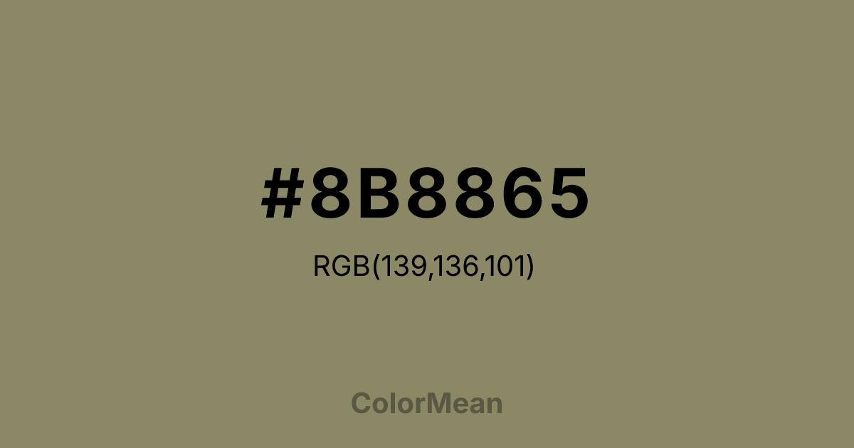 #8B8865 RGB value is (139, 136, 101). The hex color red value is 139, green is 136, and blue is 101. Its HSL format shows a hue of 55°, saturation of 16 percent, and lightness of 47 percent. The CMYK process values are 0 percent, 2 percent, 27 percent, 45 percent.