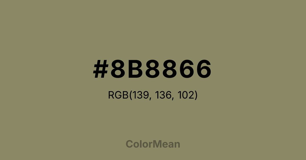 #8B8866 RGB value is (139, 136, 102). The hex color red value is 139, green is 136, and blue is 102. Its HSL format shows a hue of 55°, saturation of 15 percent, and lightness of 47 percent. The CMYK process values are 0 percent, 2 percent, 27 percent, 45 percent.