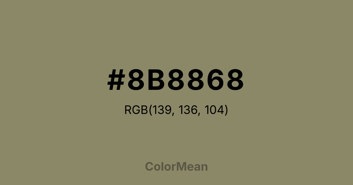 #8B8868 RGB value is (139, 136, 104). The hex color red value is 139, green is 136, and blue is 104. Its HSL format shows a hue of 55°, saturation of 14 percent, and lightness of 48 percent. The CMYK process values are 0 percent, 2 percent, 25 percent, 45 percent.