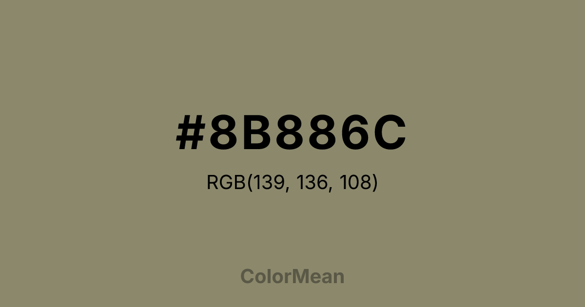 #8B886C RGB value is (139, 136, 108). The hex color red value is 139, green is 136, and blue is 108. Its HSL format shows a hue of 54°, saturation of 13 percent, and lightness of 48 percent. The CMYK process values are 0 percent, 2 percent, 22 percent, 45 percent.