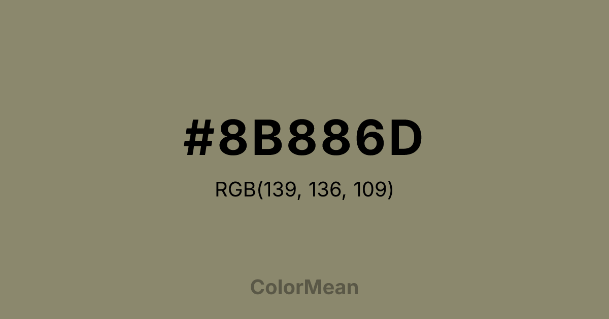 #8B886D RGB value is (139, 136, 109). The hex color red value is 139, green is 136, and blue is 109. Its HSL format shows a hue of 54°, saturation of 12 percent, and lightness of 49 percent. The CMYK process values are 0 percent, 2 percent, 22 percent, 45 percent.