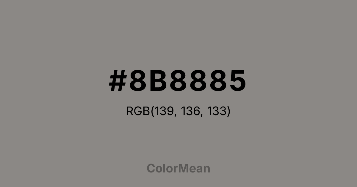#8B8885 RGB value is (139, 136, 133). The hex color red value is 139, green is 136, and blue is 133. Its HSL format shows a hue of 30°, saturation of 3 percent, and lightness of 53 percent. The CMYK process values are 0 percent, 2 percent, 4 percent, 45 percent.